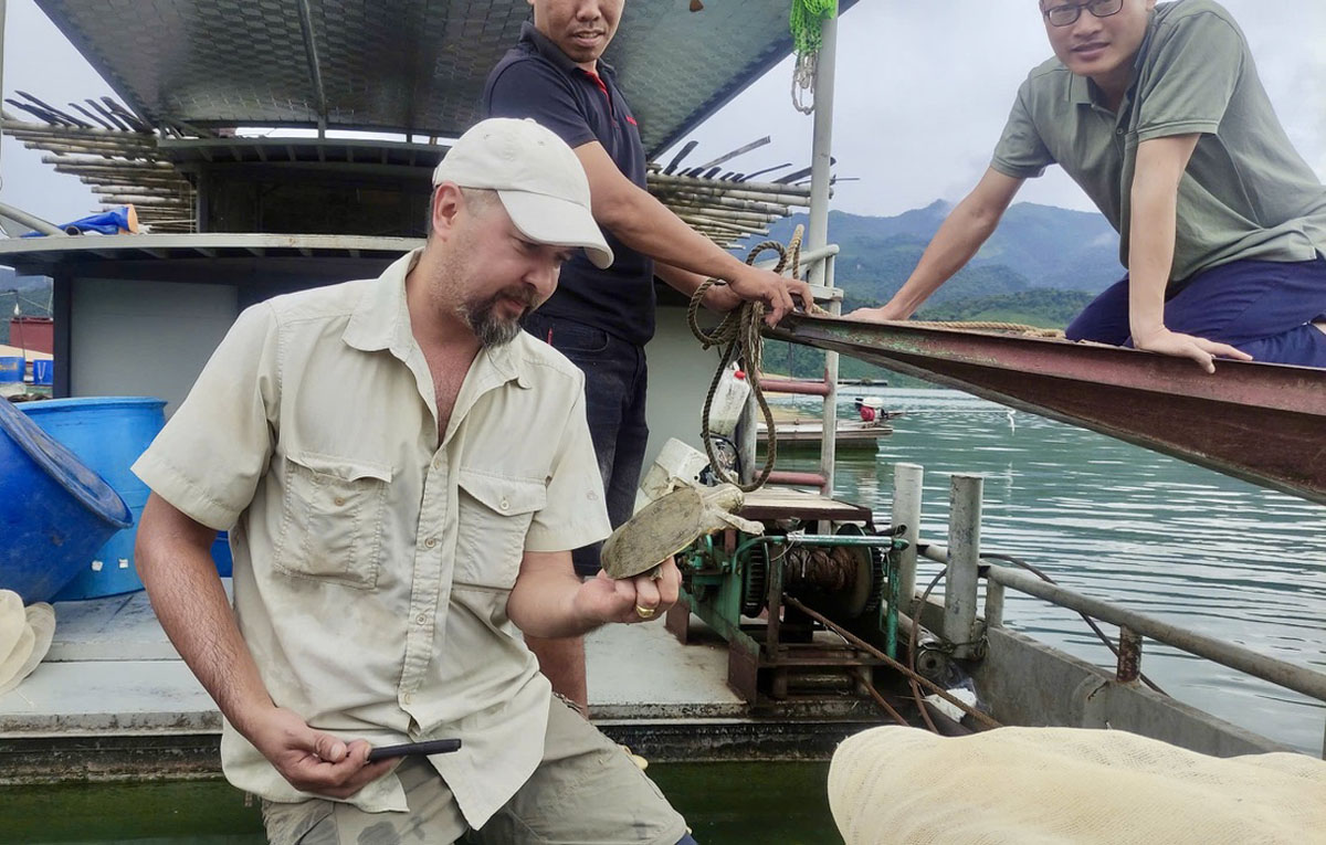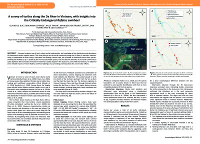 Turtle Sanctuary is committed to ensuring the survival of the Yangtze Giant Softshell Turtle (Rafetus swinhoei) in its natural habitat. Since 2019, our organization has been conducting a research program dedicated to this species, initiated through the collection of data on its geographic distribution and ecology in the river basins of northern Vietnam. This approach is based on the methodical conduct of structured interviews with local populations, combined with modeling analyses to identify the most suitable habitat areas for R. swinhoei across Vietnamese territory.